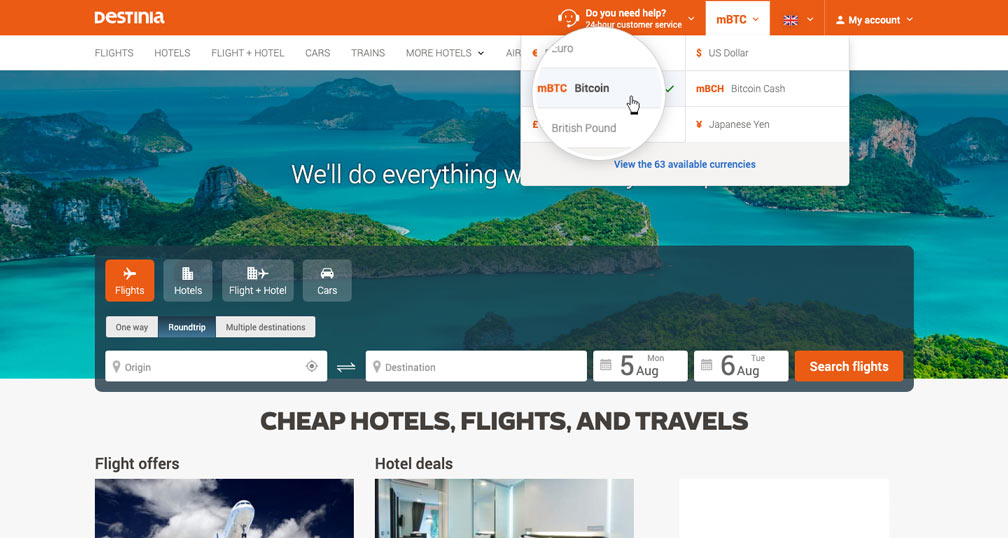 - All of Destinias online products may be purchased in bitcoins except for some hotels that only admit payment at reception and some flight where the airline only accepts credit card payments.