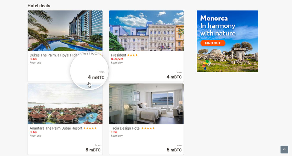 The mili-bitcoin (mBTC) is a thousandth part of a Bitcoin. Destinia has decided to show prices in mBTC as this makes the process more user-friendly and more convenient when showing prices on a daily basis.