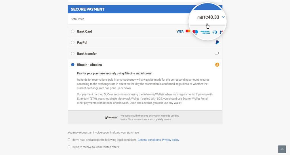 Click on the Booking button and you will always see prices in mili-Bitcoins and their equivalent in euros to facilitate the process.