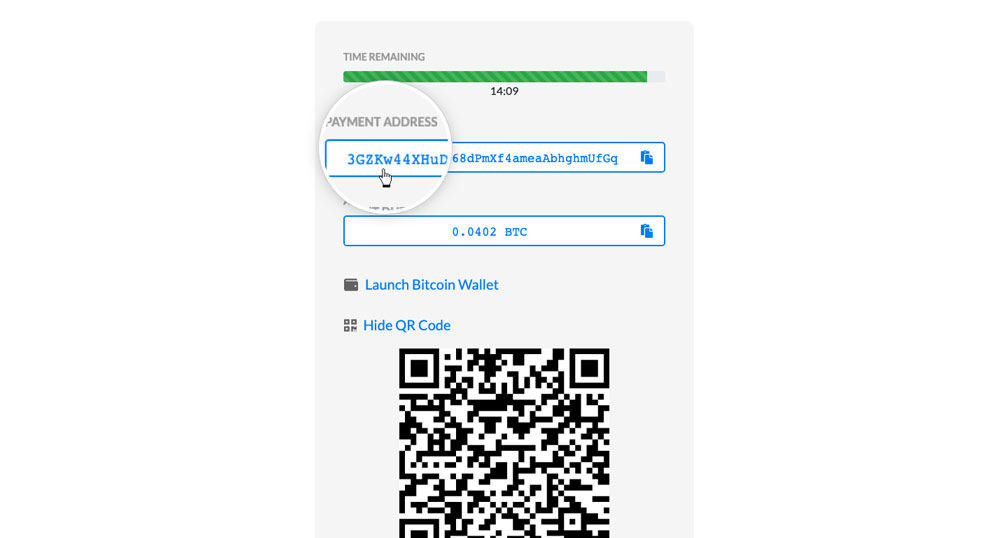 The encrypted address to where to transfer the amount will appear from your Bitcoin wallet, along with the total amount of necessary bitcoins needed to end up the reservation.